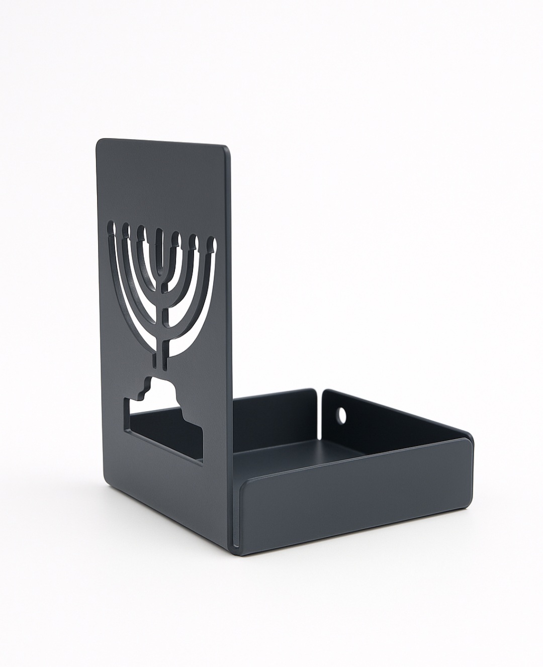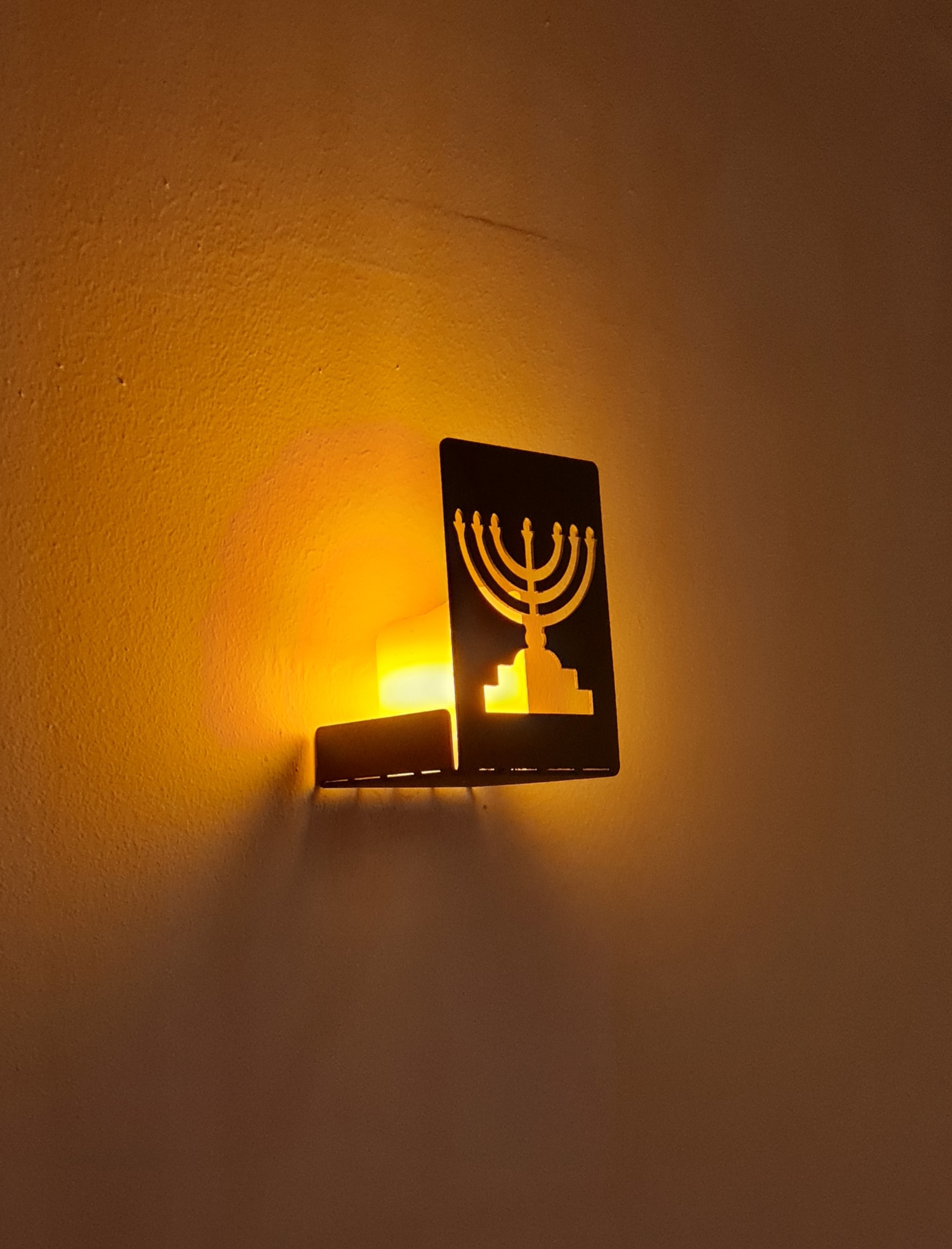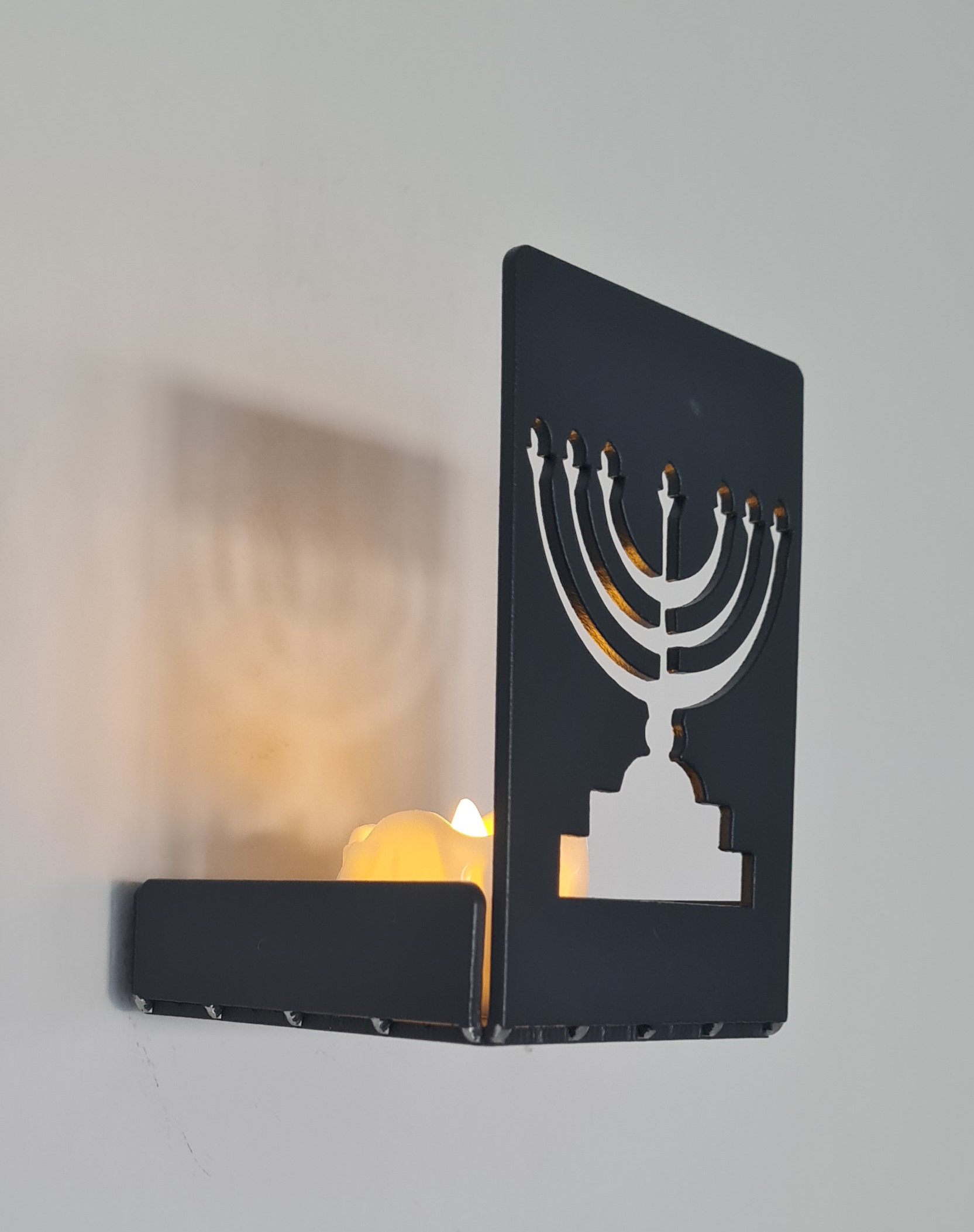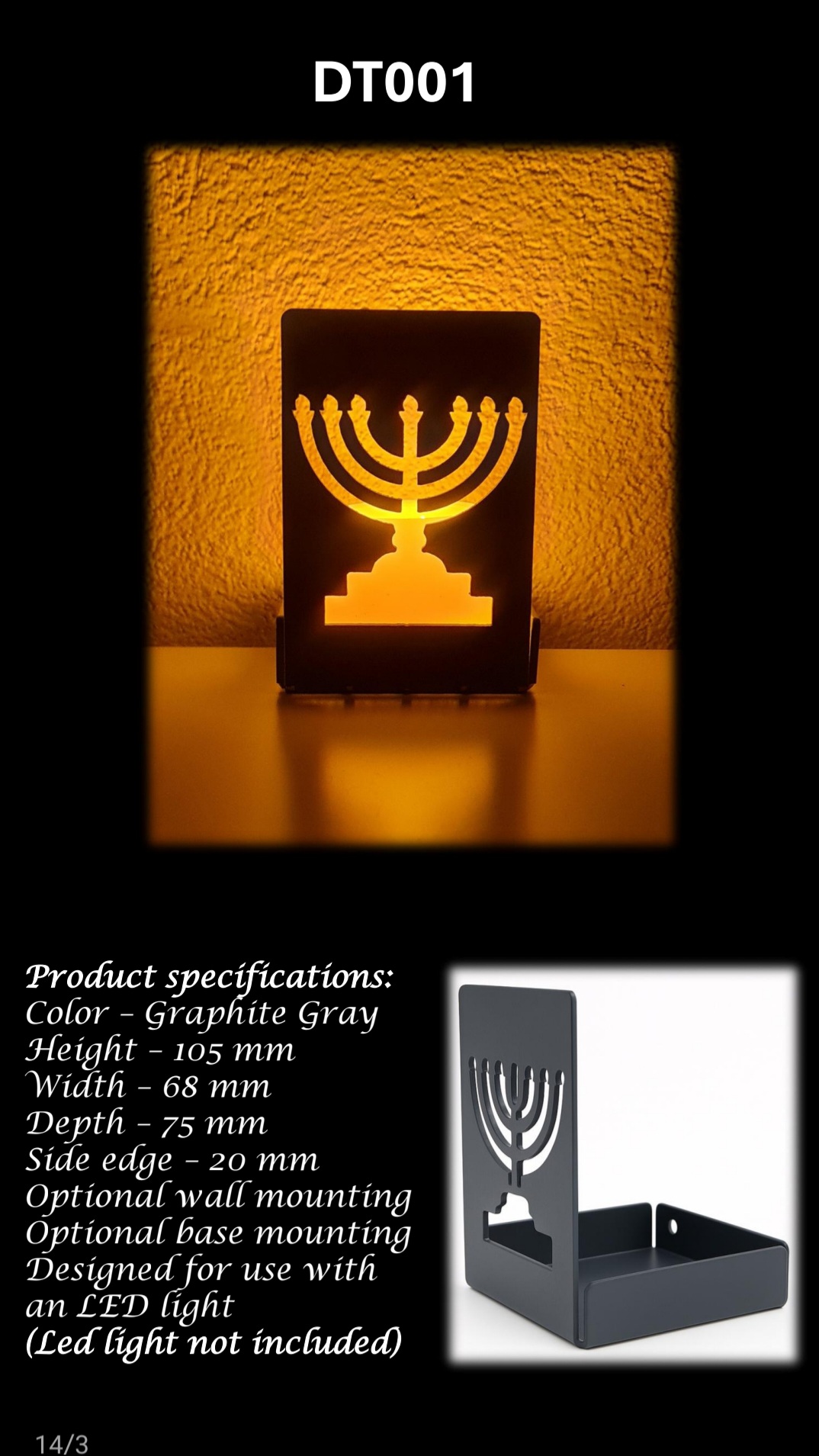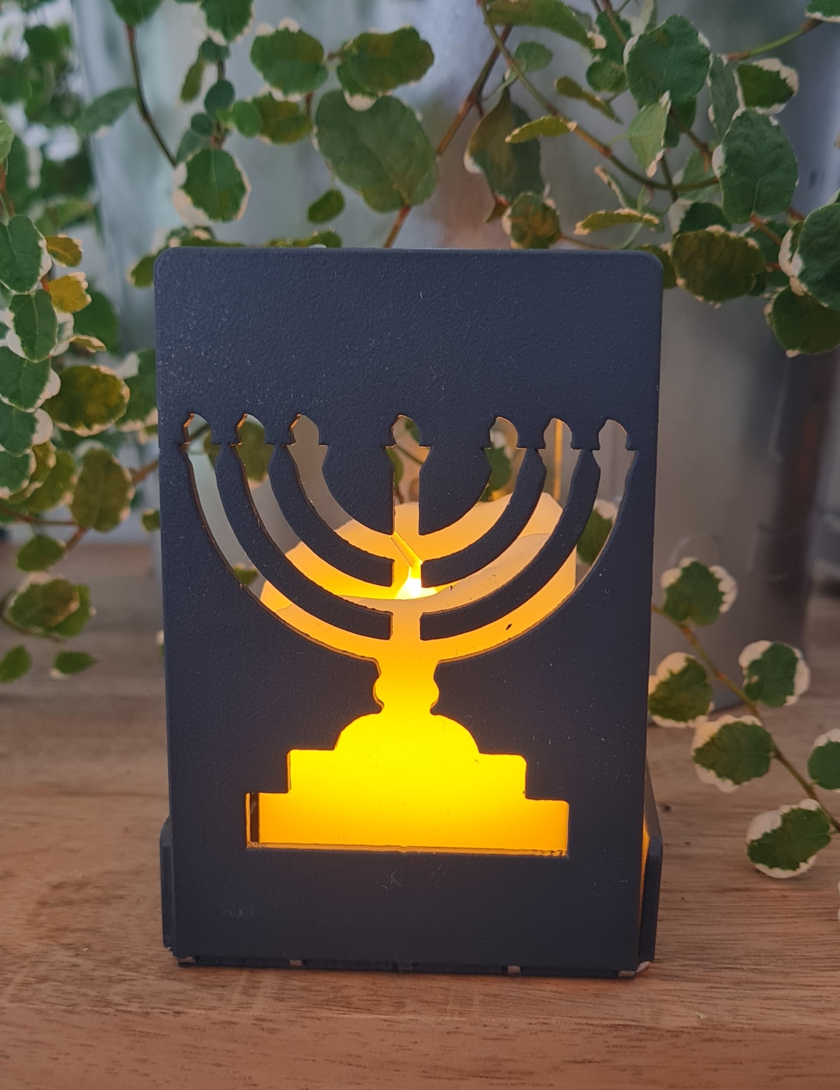 This unique LED candle holder is crafted from lightweight aluminum and finished in a durable gray powder coat. Featuring a precision laser-cut design inspired by the Temple Menorah, it creates a warm, meaningful glow when used with a flameless LED candle.