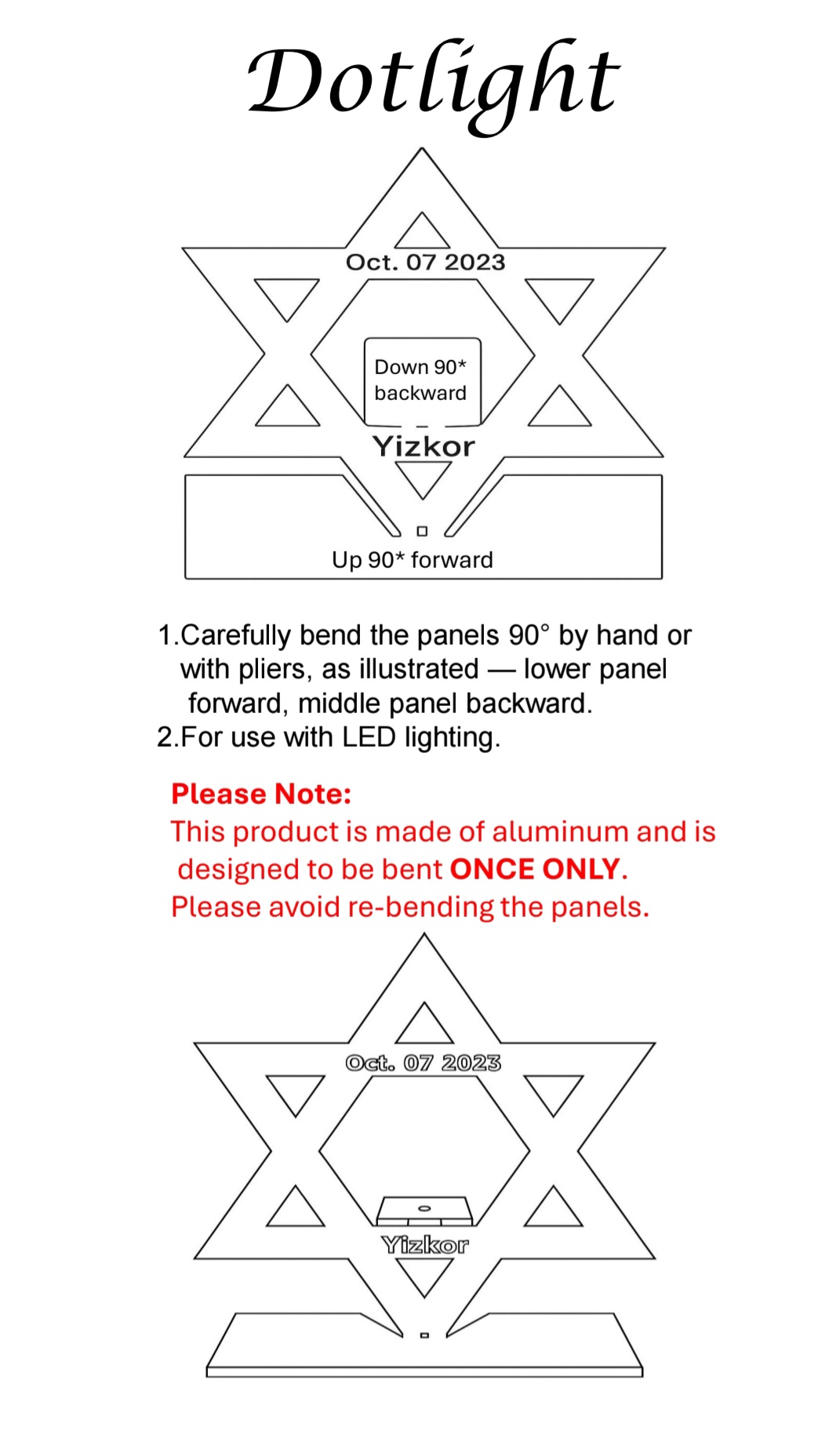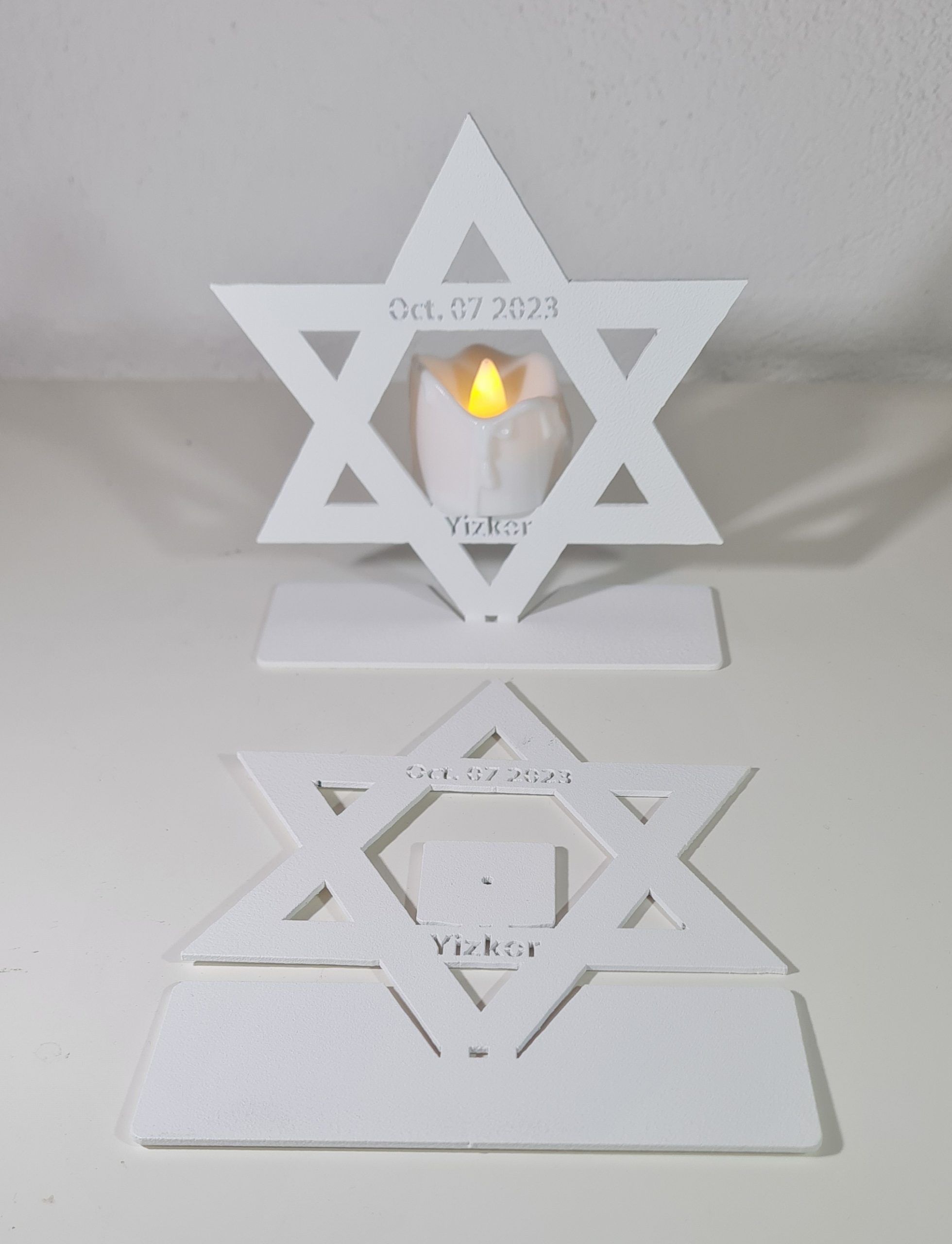 LED Memorial Candle Holder with Laser-Cut Star of David and “YIZKOR / 07 OCT 2023” Design (Aluminum, Foldable from 2D to 3D, White Finish)