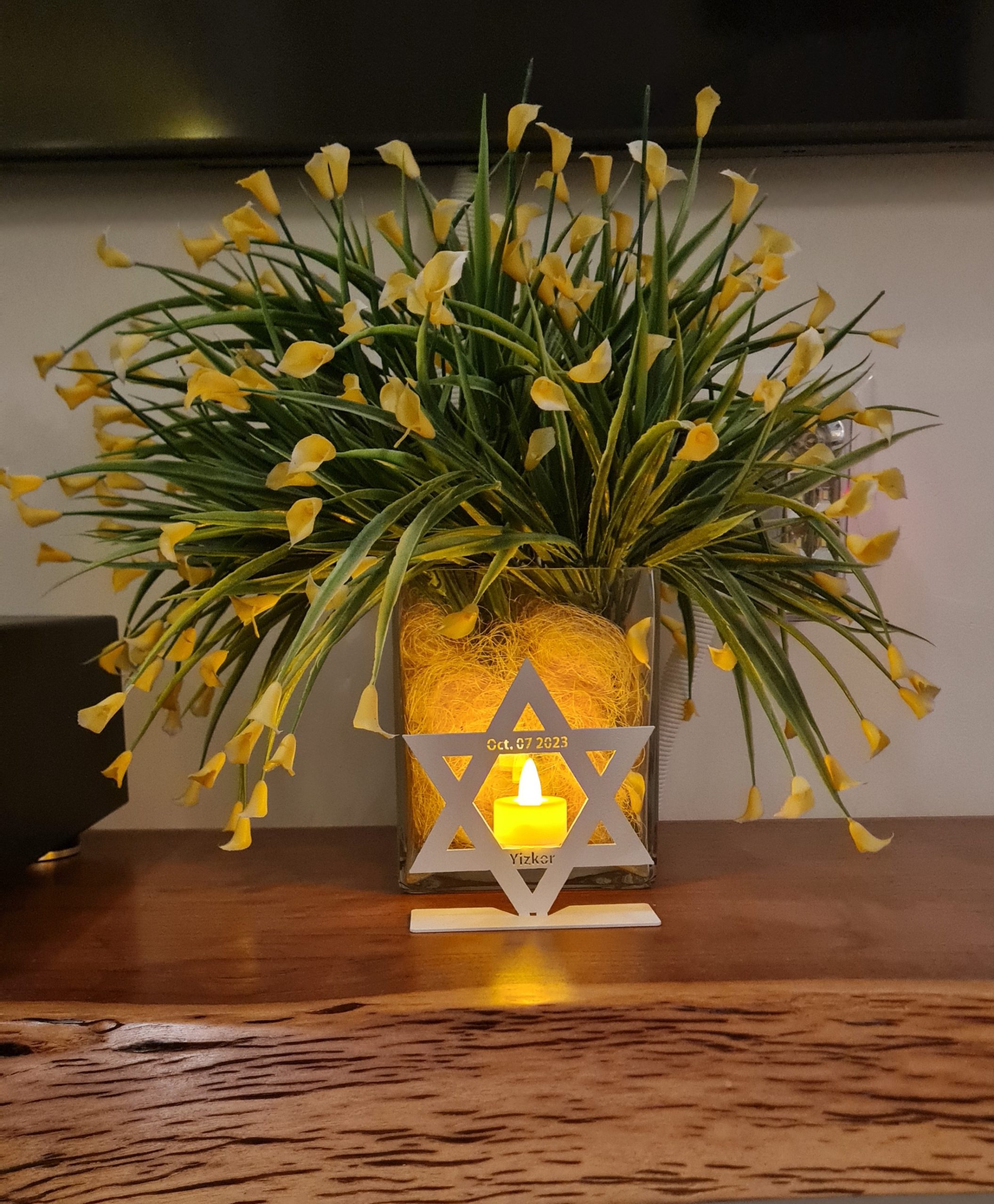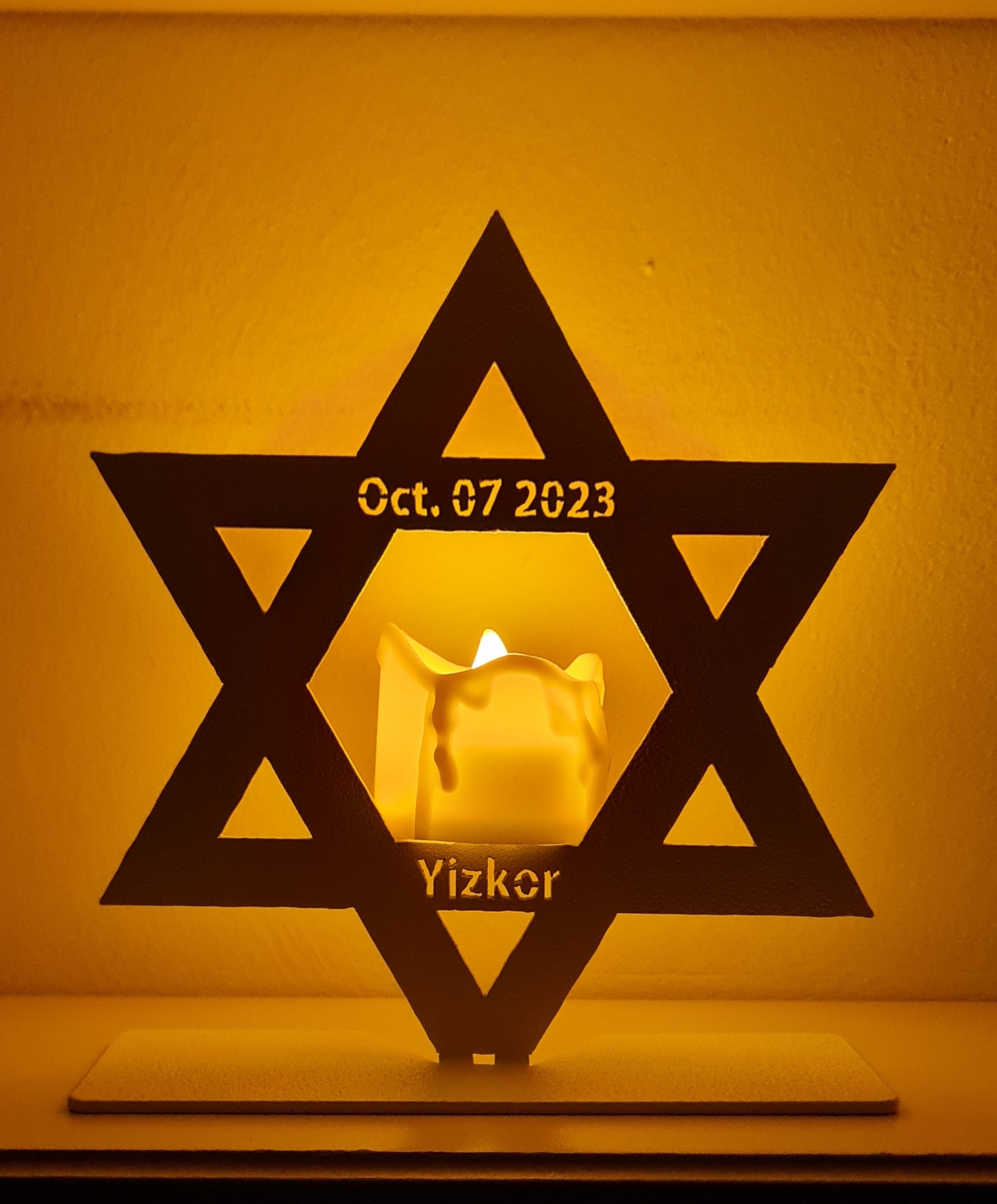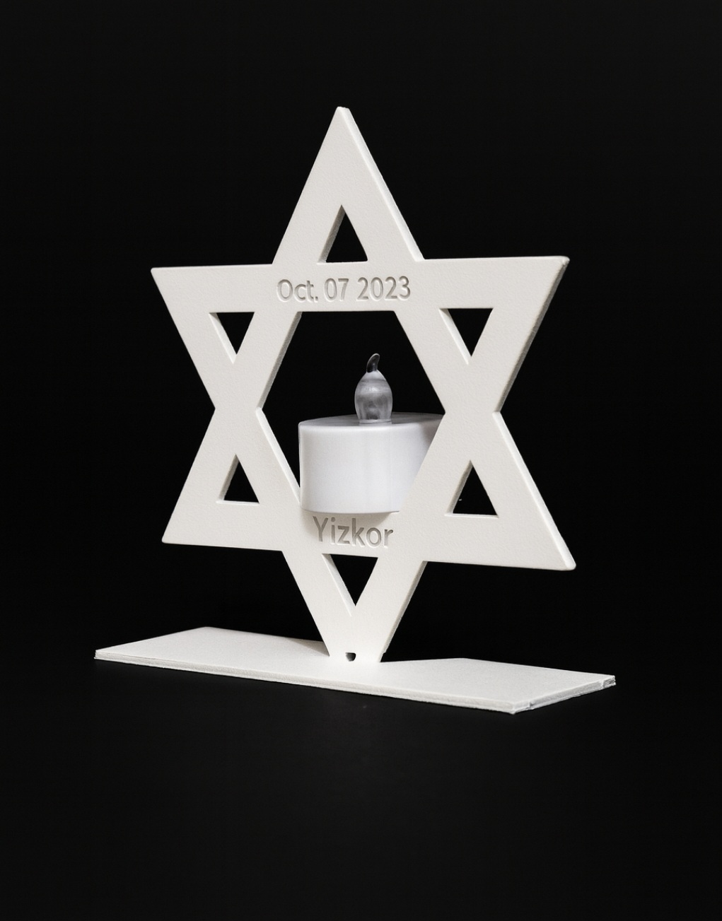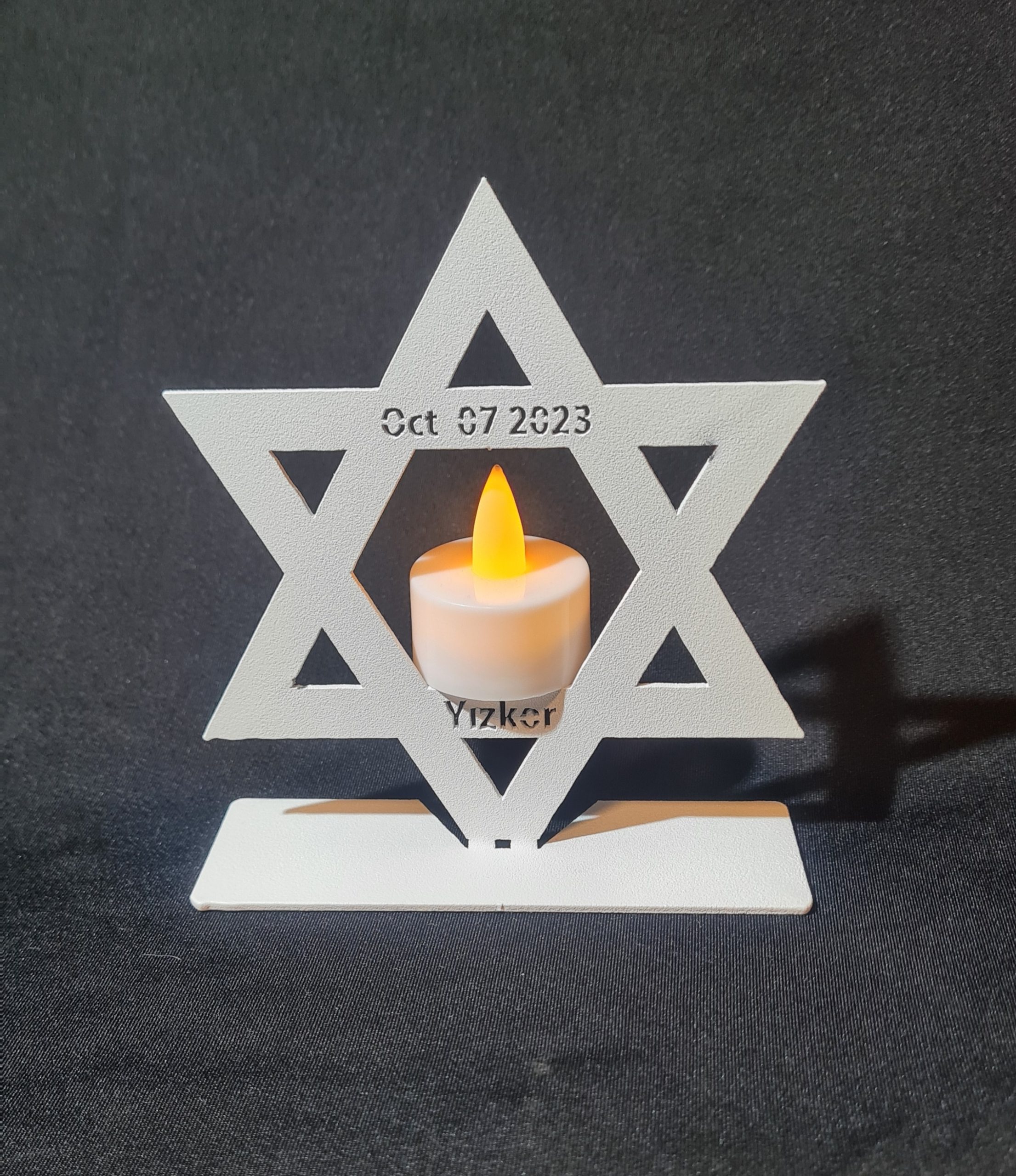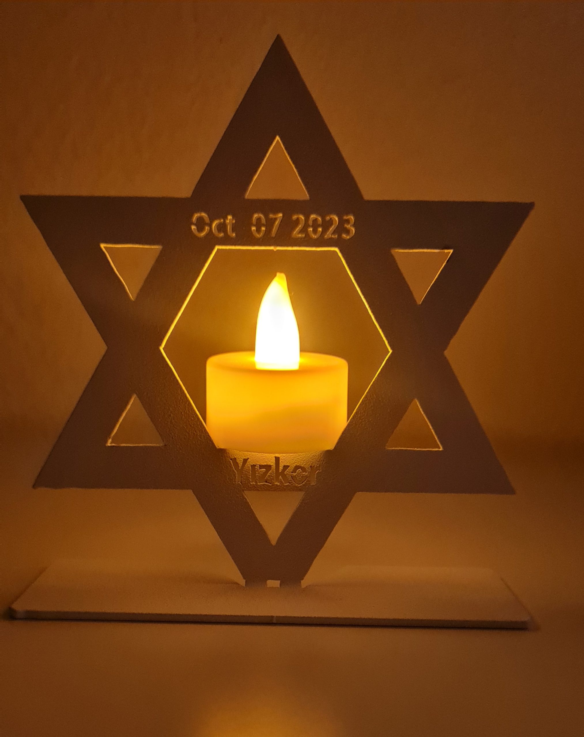 This unique LED memorial candle holder is crafted from lightweight aluminum and finished in a durable white powder coating. Featuring a precision laser-cut Star of David design with the memorial inscription “YIZKOR” and the date “07 OCT 2023,” it creates a meaningful remembrance display when used with a flameless LED candle.