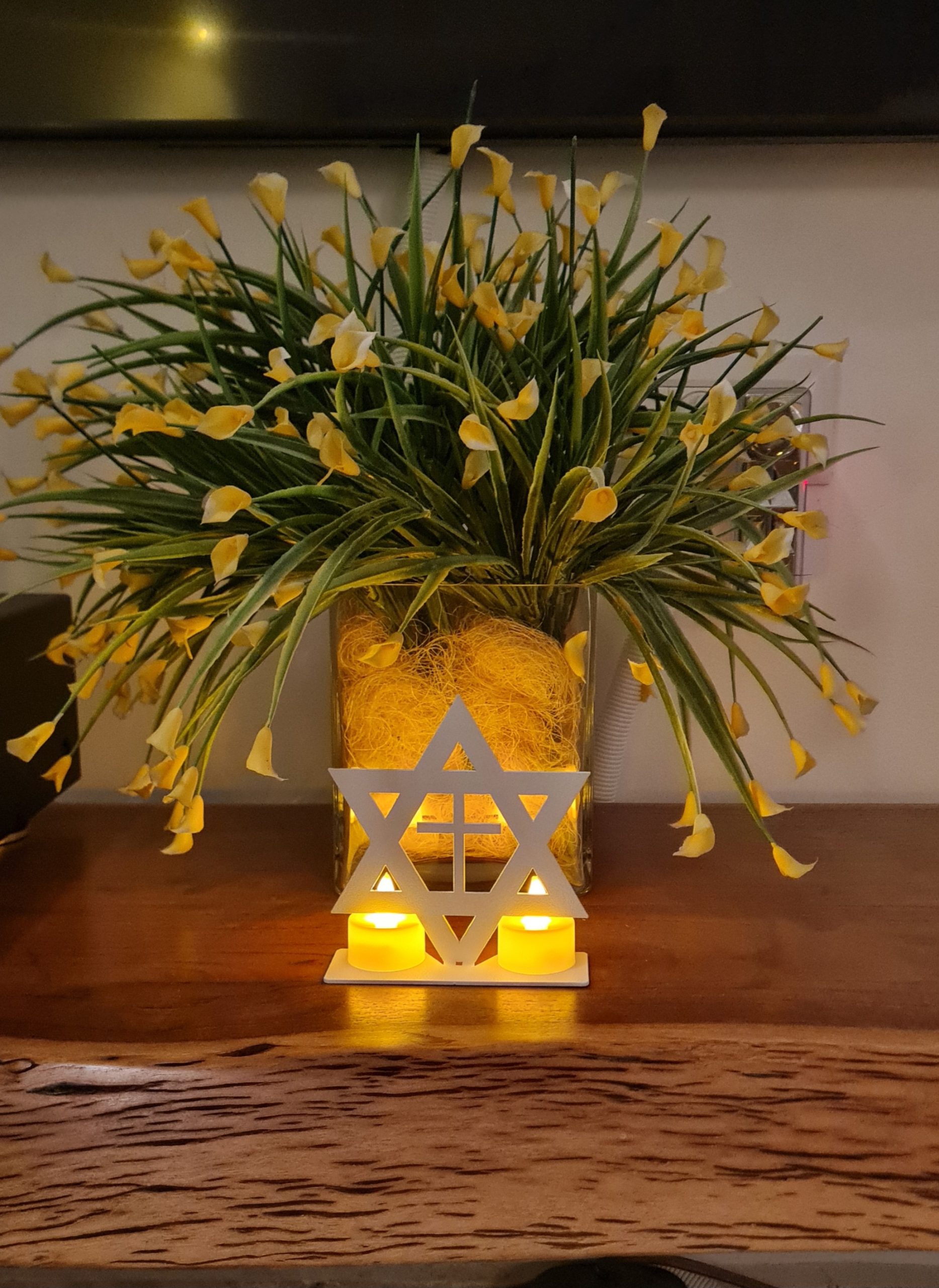 This unique decorative metal piece combines a Star of David and a cross, symbolizing the connection between Israel and Christianity. It is especially meaningful for Christian supporters of Israel, including members of the Evangelical community.