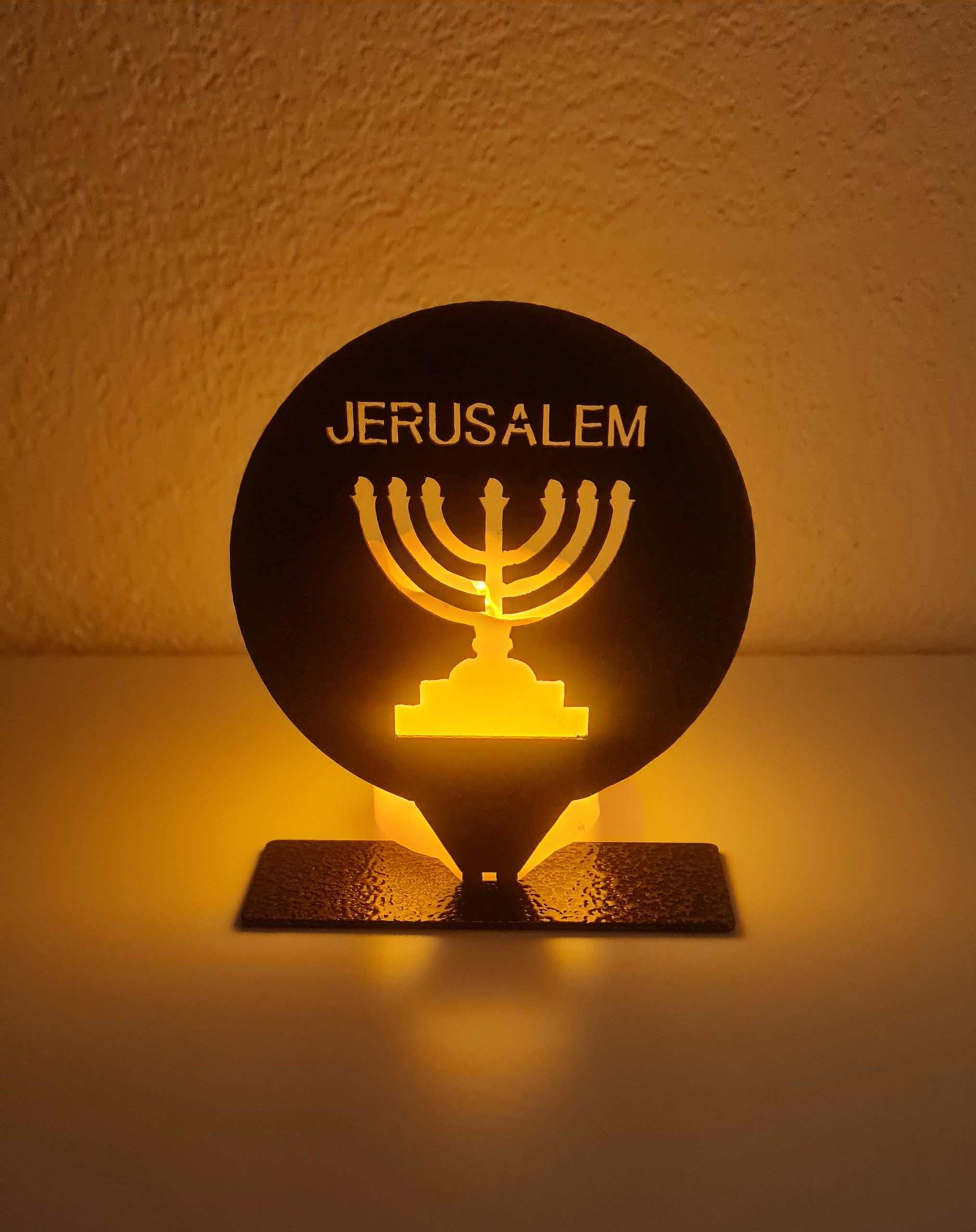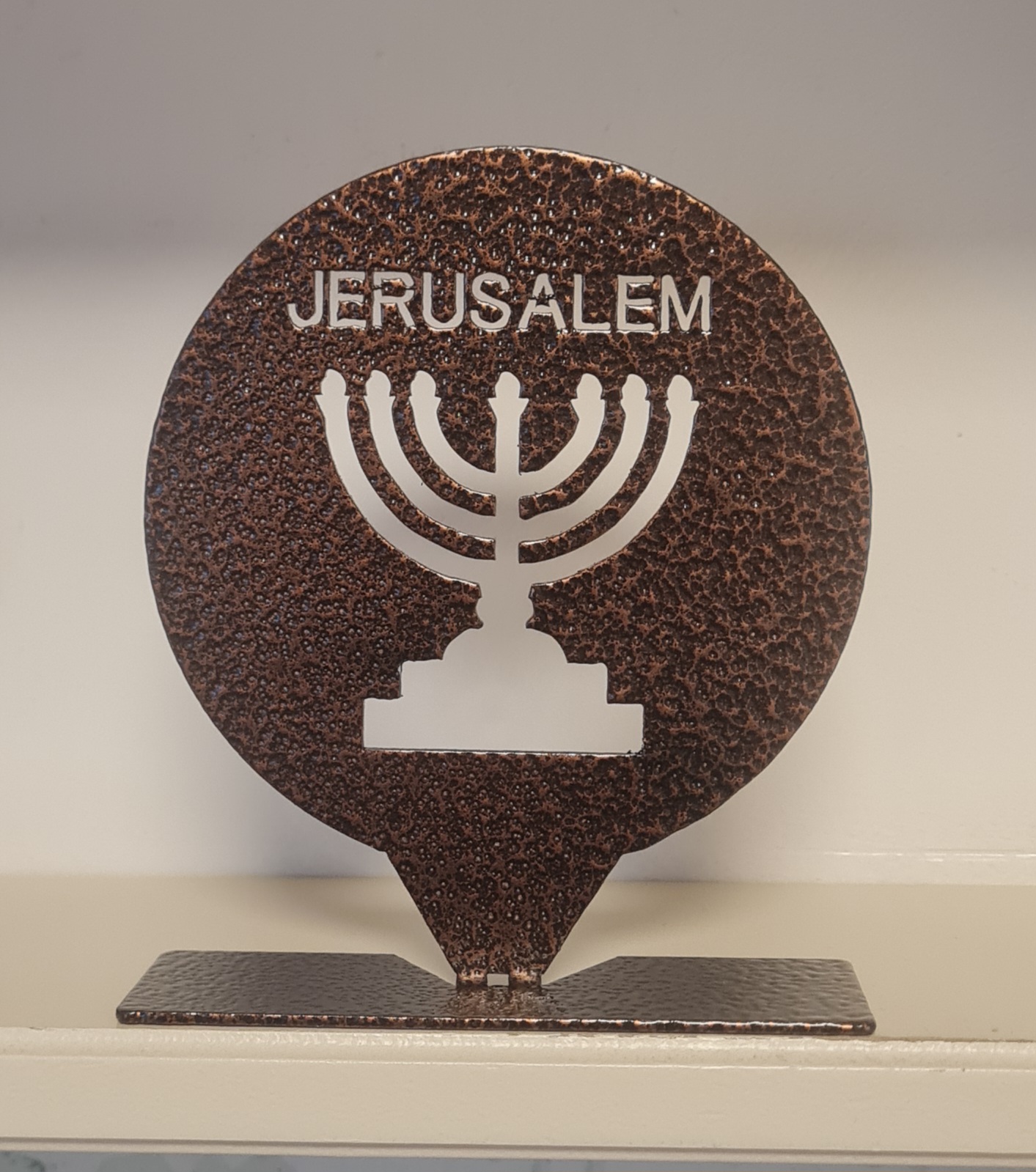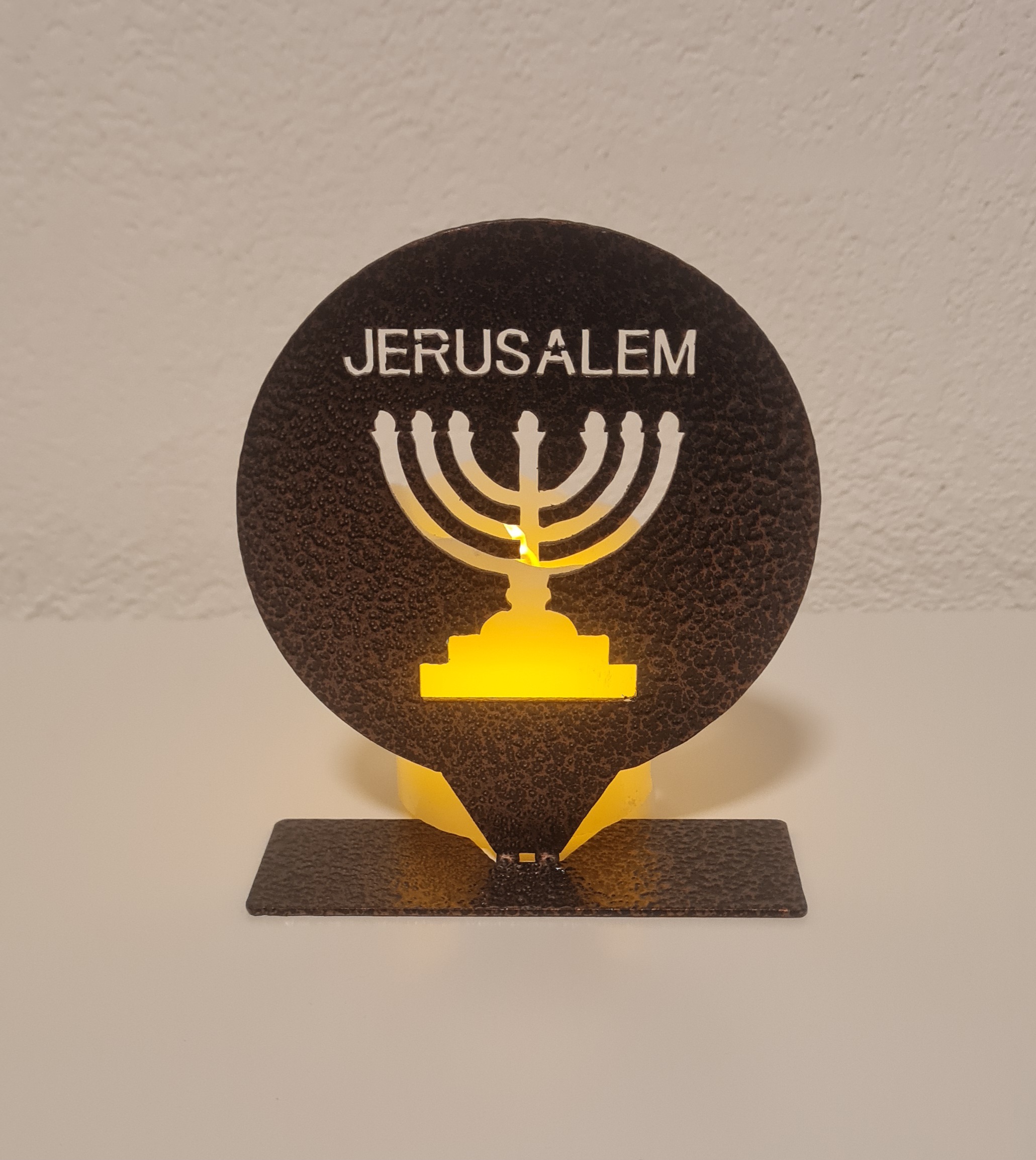 This unique decorative metal piece features a Menorah set within a round frame with the inscription “JERUSALEM” at the top, creating a meaningful design inspired by Jerusalem, Israel, and the Holy Land.