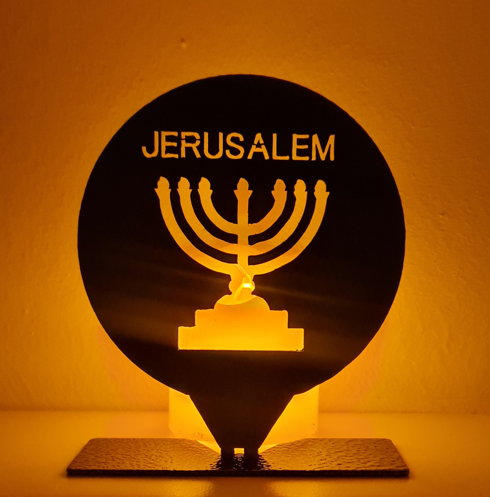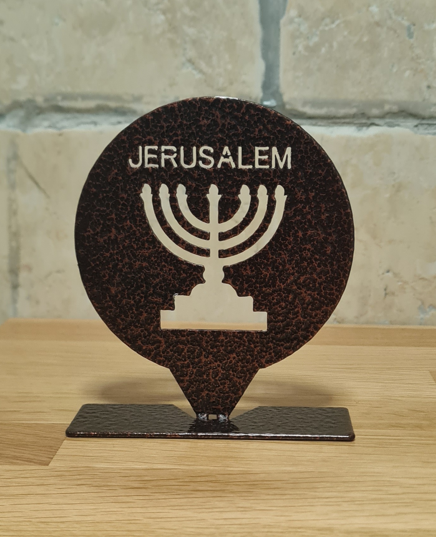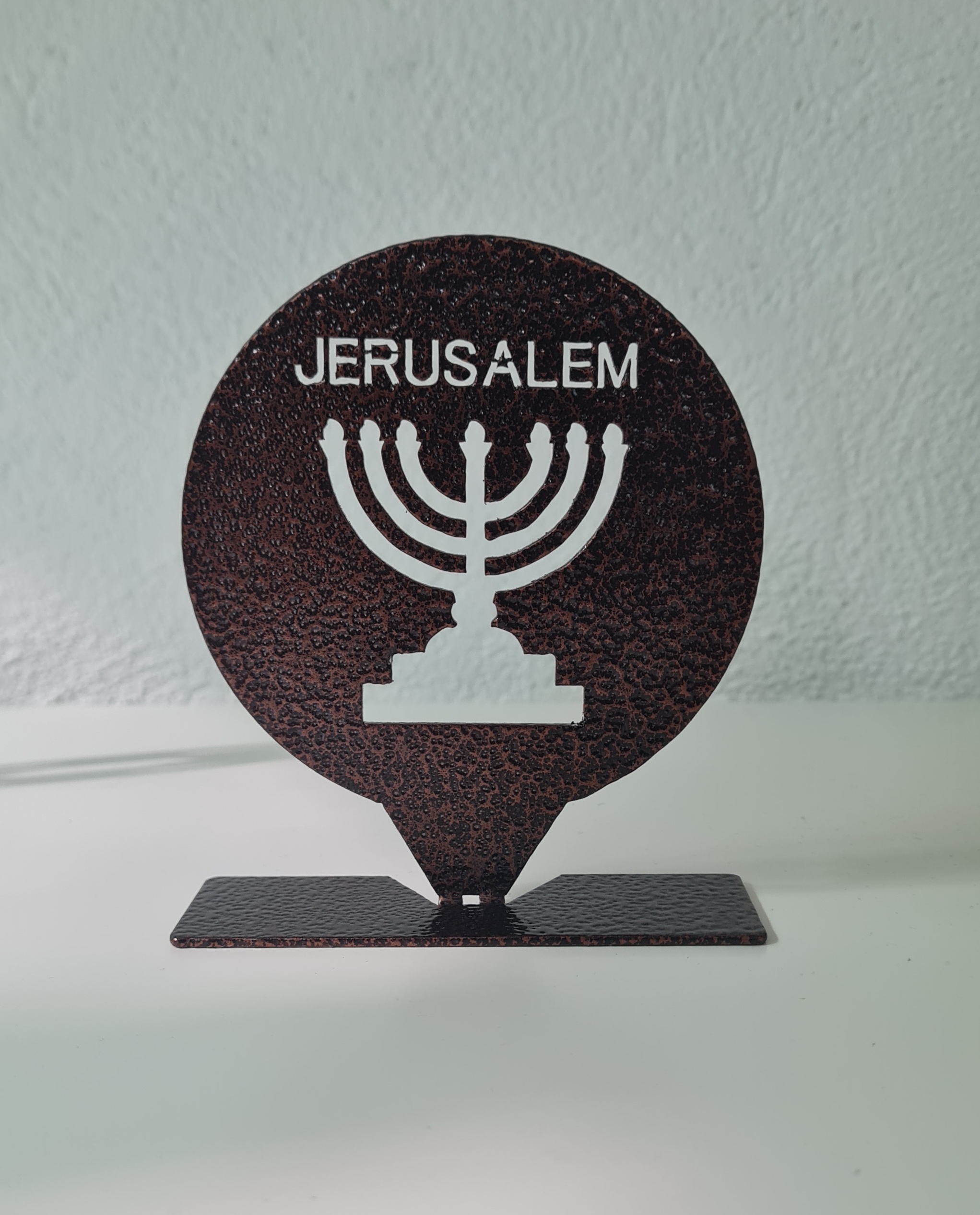 This unique decorative metal piece features a Menorah set within a round frame with the inscription “JERUSALEM” at the top, creating a meaningful design inspired by Jerusalem, Israel, and the Holy Land.