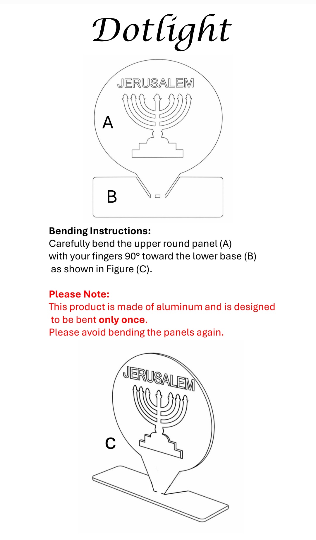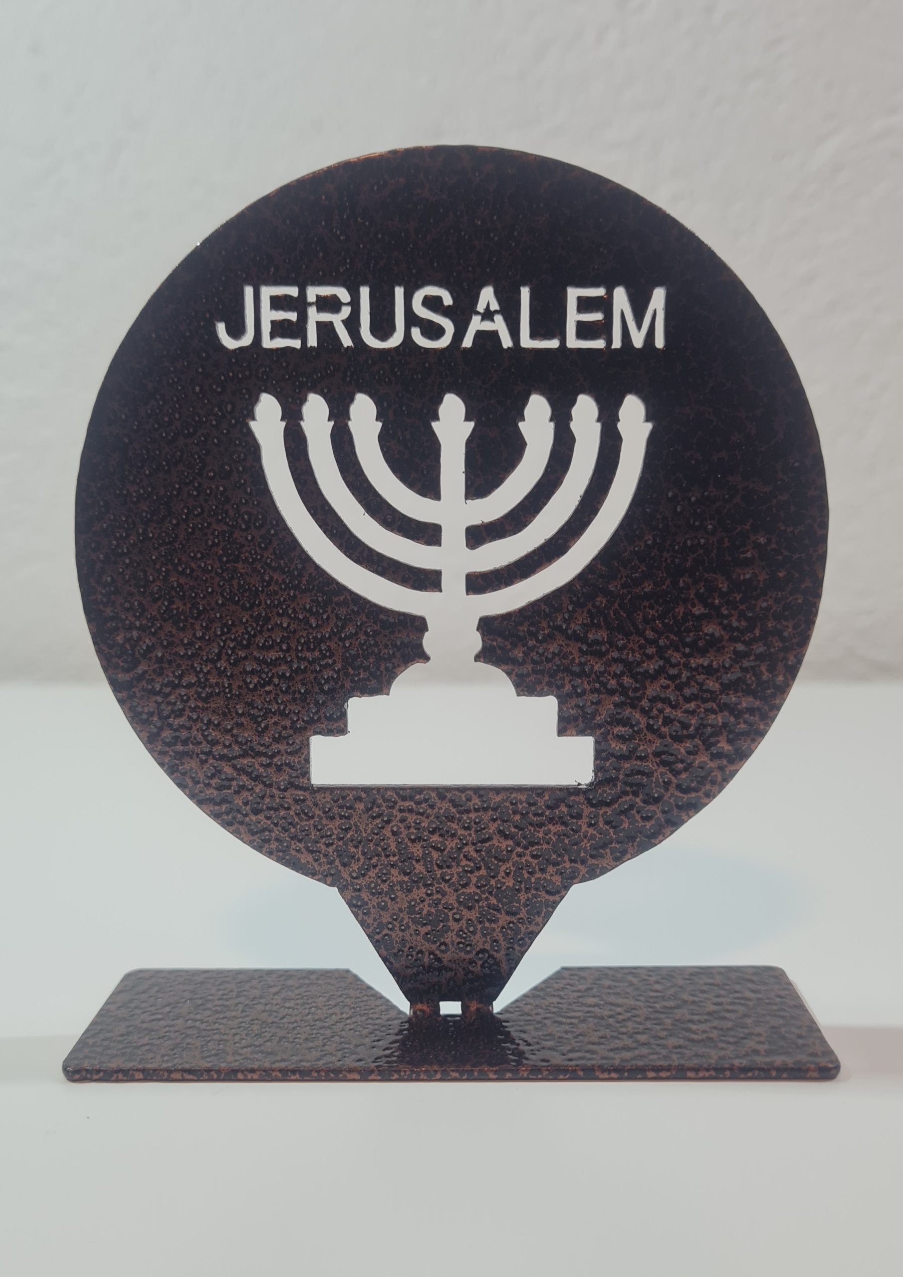 Laser-Cut Round Menorah with “JERUSALEM” Inscription (Aluminum, Foldable from 2D to 3D, Hammered Copper Finish)